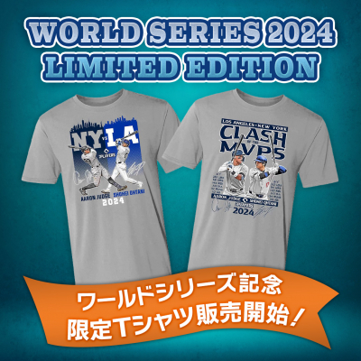 今年それぞれのリーグで二冠王を達成した大谷翔平選手とアーロン・ジャッジ選手。43年ぶりとなるロサンゼルス・ドジャース対ニューヨーク・ヤンキースのワールドシリーズが開幕し、この両雄がプリントされた、ワールドシリーズ記念の限定数販売Tシャツが予約受付中です。