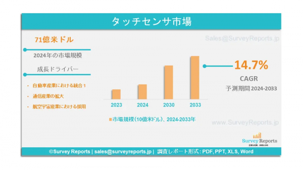 Survey Reports LLCは、2024年11月に調査レポートを発行したことを発表した。タッチセンサー市場のセグメンテーション(タイプ別(抵抗膜方式、静電容量方式、表面弾性波方式(SAW);赤外線、光学)、チャネルタイプ別(マルチチャネル&シングルチャネル);設置エリア別(スマートフォン&タブレット、ノートパソコン、自動車&航空機ソリューション、エレベーター、ATM、医療機器、パネル制御システム、キオスクソリューション&その他);エンドユーザー別(家電、自動車、航空宇宙、医療、工場オートメーション、小売&その他) - グローバル市場分析、トレンド、 航空機ソリューション、エレベーター、ATM、医療機器、パネル制御システム、キオスクソリューション、その他)別、エンドユーザー別(民生用電子機器、自動車、航空宇宙、医療、工場オートメーション、小売店、その他)別 - 2024年から2033年までのグローバル市場分析、動向、機会、予測を提供する。これは、タッチセンサー市場の成長促進要因、市場機会、課題、脅威など、いくつかの重要な市場力学を強調している。