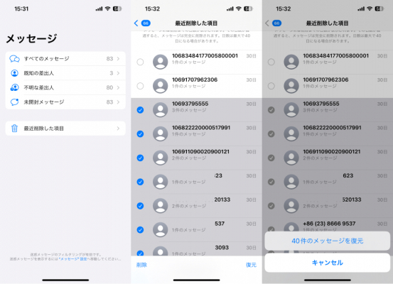 ● メリット: パソコン不要で削除したメッセージを復元できる。
