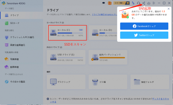 1.Tenorshareの公式サイトから無料版をダウンロードし、インストールします。復元したいSSDや他のストレージデバイスを選択し、スキャンを開始します。(右上隅にある「シェア」ボダンをクリックし、FacebookまたはTwitterに拡散して2GBまでデータを無料で復元できます。)