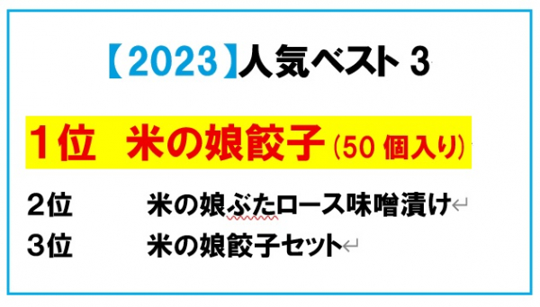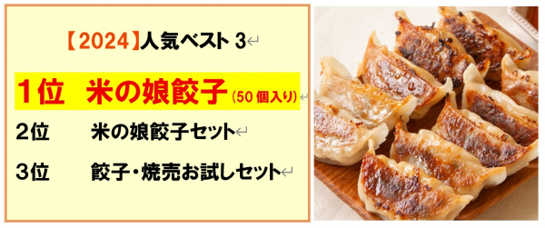 1位の『米の娘餃子(50個入)』は、その名の通り50個入りの大容量袋で、2023年人気ランキングに引き続き1位をキープ。ギフトで贈られ、リピートしていただいている方が多いと考えられ、「冷凍庫には必ず常備必須!」「50個だとあっという間に食べてしまう!100個注文しました!」など嬉しいお声もいただいております。