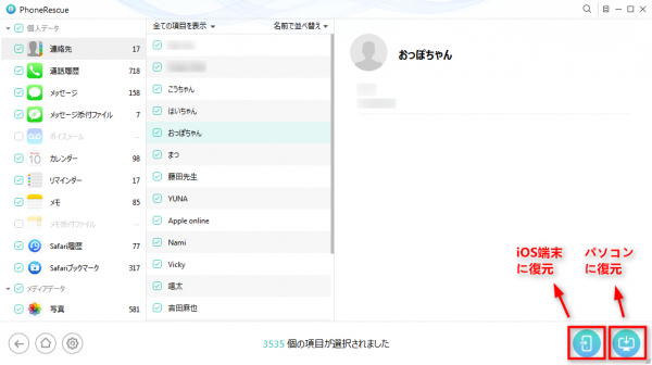 ステップ4、具体的なコンテンツを選択し、「iPhone」または「パソコン」に復元します。