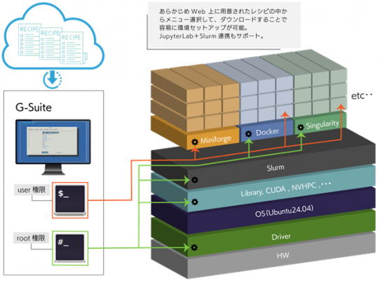 またG-Suiteでは、Ubuntu 24.04に対応し、開発環境はminiforgeをベースとしています。各世代のGPUに最適化してビルドしたソフトウェア群に加え、OSネイティブ環境+コンテナ環境をハイブリッドにサポートするアプリケーションリソースマネージメントツールです。ユーザーは様々なアプリケーション実行環境を構築することが可能であり、レシピは全てフリーでアクセスできます。