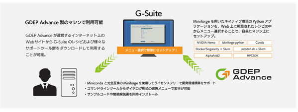 G-Suiteはジーデップ・アドバンス製品にインストールされるソフトウェアで、インターネット上のWebサイトから様々なレシピやサポートツール群をダウンロードし、簡易解説書やチュートリアルを含むアプリケーション実行環境を構築することが可能です。最適化されたフレームワークが実装されているためユーザーが面倒な構築作業を行うことなく届いたその日からAIの研究開発を開始できます。