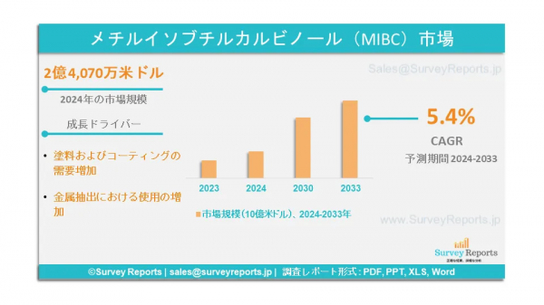 Survey Reports LLCは、2025年3月、メチルイソブチルケトン(MIBC)市場の用途別(可塑剤、起泡剤、腐食防止剤、潤滑油および油圧流体、その他の用途)セグメント化、タイプ別(グレード98%、グレード9371.4%、グレード99%)セグメント化、エンドユーザー産業別(建設、鉱業、自動車、ゴム、その他のエンドユーザー産業)セグメント化に関する調査レポートを発行したと発表した。 4%、グレード99%)別、エンドユーザー産業別(建設、鉱業、自動車、ゴム、その他エンドユーザー産業) - 2024年から2033年までの世界市場分析、動向、機会、予測を提供する。これは、メチルイソブチルケトン(MIBC)市場の予測評価を提供する。メチルイソブチルカルビノール(MIBC)市場の成長促進要因、市場機会、課題、脅威など、いくつかの重要な市場力学に焦点を当てている。