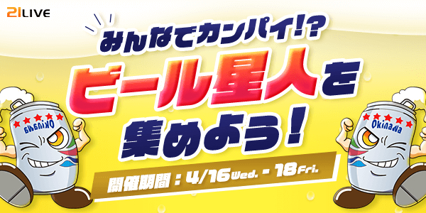 【21LIVE】4月16日(水)『ビール星人を集めよう!』を開催!ビール星人を集めた上位入賞者に春の特別オリオンビールをプレゼント!