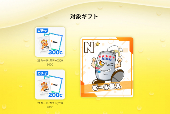 『ビール星人を集めよう!』は、21LIVEの人気ギフト「オキコレ」の21カードガチャ「200ガチャ」「300ガチャ」からビール星人を集めるイベント。