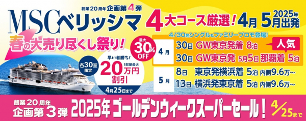 クルーズ予約サイト「ベストワンクルーズ」、本日より、4月30日発MSCベリッシマ東京発着ゴールデンウィーククルーズの割引・特典内容を拡充いたしました