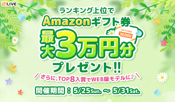【21LIVE】5月25日(日)『ランキング上位でAmazonギフト券最大3万円分プレゼント!』開催!ランキングに入賞してAmazonギフト券とWebモデル出演権を獲得!