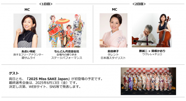 ゲストは、「2025 Miss SAKE Japan」が初登場の予定です。6月13日(金)開催の2025 Miss SAKE Japan 最終選考会後に、公式サイト、SNS等で発表します。
