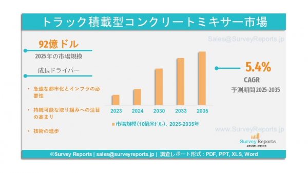 Survey Reports LLCは、2025年5月に「トラック搭載型コンクリートミキサー市場セグメンテーション:タイプ別(コンクリートポンプトラック、容積式コンクリートトラック、悪路対応コンクリートトラック);搭載車両別(トラック、トレーラー);混合容量別(6m⊃3;未満、6m⊃3;から10m⊃3;、10m⊃3;超)」、および製品タイプ別(トラック搭載型移動式ポンプ、トラック搭載型固定式ポンプ、トラックミキサーコンクリートポンプ)のグローバル市場分析、動向、機会、予測(2025-2035年)と題する調査報告書を発行しました。製品タイプ別(トラック搭載式移動式ポンプ、トラック搭載式固定式ポンプ、トラックミキサーコンクリートポンプ)- グローバル市場分析、動向、機会、および予測(2025年~2035年)を発行しました。この報告書は、トラック搭載型コンクリートミキサー市場の予測評価を提供し、成長要因、市場機会、課題、および脅威を含む、トラック搭載型コンクリートミキサー市場の主要な市場動向を強調しています。
