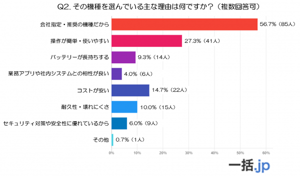 その理由について見てみると、「会社指定・推奨の機種だから」という回答が56.7%と過半数を占めており、多くの企業で一括管理や統一運用が優先されている実態が浮き彫りになりました。加えて、「操作が簡単・使いやすい」という実用性を重視する声も27.3%を占めており、現場でのスムーズな運用や従業員の負担軽減が重要なポイントとなっていることがうかがえます。