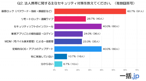 最も多かったのは「画面ロック(パスワード・指紋・顔認証など)」を実施しているという回答で、全体の60.7%を占めました。