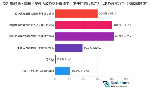 「絞り込み条件の数が多すぎて迷う」(30.0%)、「条件入力が面倒、手間がかかる」(19.3%)といった声も一定数あり、項目の多さや煩雑さもユーザー体験を損なう要因になっています。