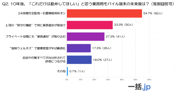 最も多かったのは「24時間完全監視・位置情報常時オン」で、全体の54.7%(82人)が懸念を示しています。業務端末の利便性が高まる一方で、プライバシーの過度な侵害や監視強化には強い拒否感があることが分かります。