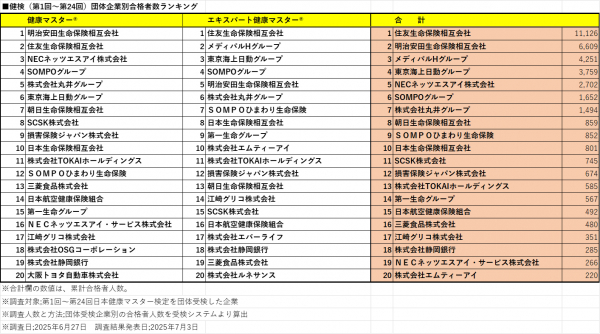 (調査対象;第1回〜第24回健康マスター検定を団体受検した企業 調査人数と方法;団体受検企業別の合格者人数を受検システムより算出 調査日;2025年6月27日 調査結果発表日;2025年7月3日)
