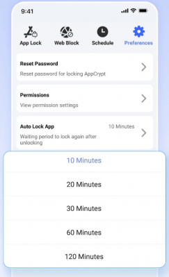 AppCryptはUIが直感的で分かりやすいですので、誰でも簡単に利用できます。アプリを保護したり、特定の時間帯でアプリをロックしたり、気が散るサイトをブロックしたりするのに使用できます。