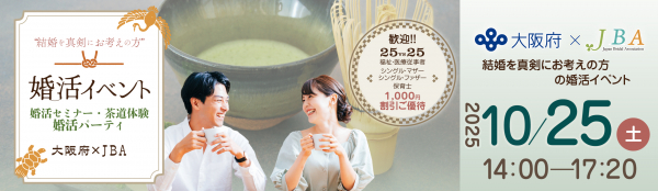 大阪府と一般社団法人日本結婚相談協会 (JBA)は結婚・婚活支援に関する事業連携協定を締結しております。その取組みの一環として、令和7年10月25日 (土曜日) に婚活イベントを開催しますのでお知らせします。婚活セミナーでは、講師が婚活にあたっての心構え等について説明します。表千家講師による、茶道体験あり。また、 福祉及び医療従事者、シングルマザー及びシングルファザー、保育士の方は参加費が1,000円割引となります。是非この機会にご参加ください。