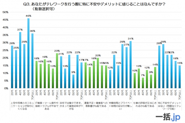 テレワークにおける不安やデメリットについての回答からは、世代ごとに感じる課題の優先度や性質が異なることが見えてきました。コミュニケーション面や業務効率への影響、健康面、評価制度への懸念など、多岐にわたる声が挙がっています。