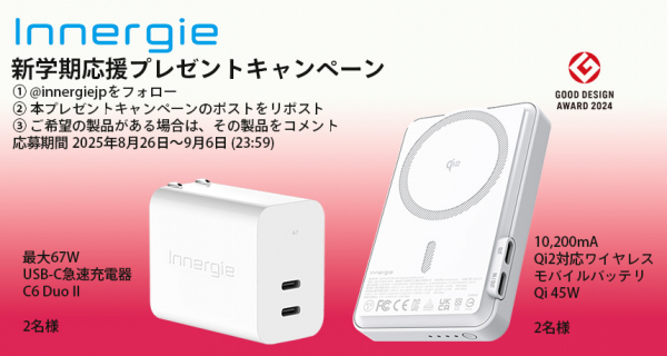 2025年8月26日 - デルタ電子株式会社. 東京都港区 - デルタ電子株式会社は、コンシューマ向け電力ソリューションブランド「Innergie(イナジー)」の日本公式Xアカウント @innergiejp において、新学期応援プレゼントキャンペーンとして、新発売の最大67W出力に対応したデュアルポートUSB-C急速充電器「Innergie C6 Duo II」と、応援購入サービスのMakuakeにて9月6日まで先行販売を行なっているQi2対応10,200mAhマグネット式USB-Cモバイルバッテリ「Innergie Qi2 45W」を各2名様にプレゼントいたします。