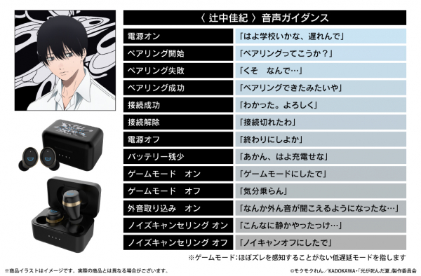 本モデルは、「辻中 佳紀(CV:小林 千晃)」、「ヒカル(CV:梅田 修一朗)」の2モデル展開で、録り下ろし音声ガイダンス(各13ワード)を搭載。充電ケースの天面とイヤホン本体には作品をイメージしたアイコンやロゴをあしらい、シックで普段使いしやすい商品となっております。