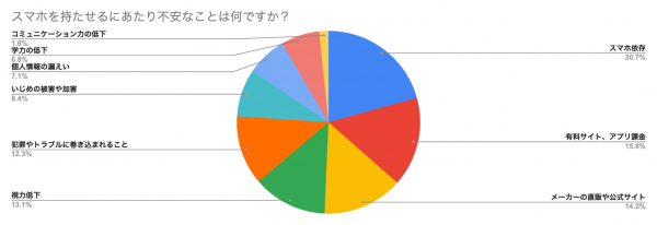 子供にスマホを持たせるにあたって、どのような不安があるかの調査結果は「スマホ依存」がトップで20.7%でした。次いで「有料サイトやアプリ課金」が15.8%、「視力低下」が13.1%という結果になりました。