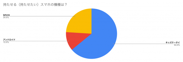 子供に持たせる(持たせたい)スマホの機種を調査したところ、トップは「キッズケータイ」で64.0%でした。次いで「iPhone」が24.0%、「Android」が12.0%でした。