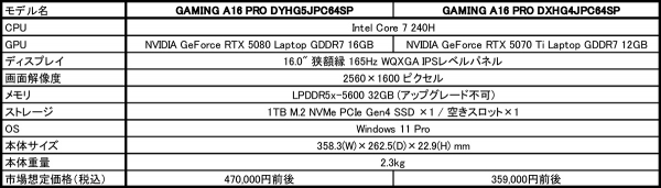 GAMING A16 PROシリーズ2製品の主な仕様と市場想定価格は以下のとおりです。