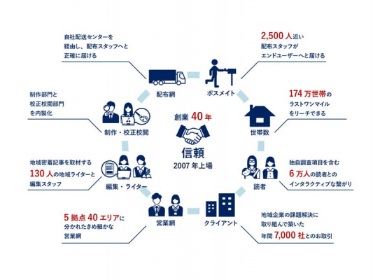 当社は、地域密着型の生活情報誌『ちいき新聞』の発行を軸に、情報発信および販売促進の総合支援事業を展開しており、年間約7,000社にサービスを提供しています。千葉県を中心に毎週発行している『ちいき新聞』は、専属の配布員により174万世帯へポスティングされ、創業以来40年以上にわたり配布を継続してきたことで、他に類を見ない九つのアセットを築いてきました。