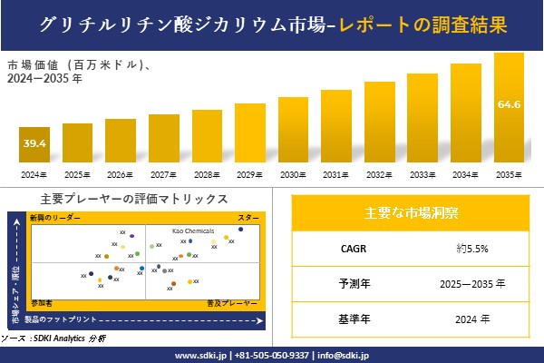 SDKI Analytics(本社:東京都渋谷区)は、このたび、2025年10月21に「グリチルリチン酸ジカリウム市場調査レポート:2025−2035年の市場規模、シェア、傾向の予測」を発表しました。グリチルリチン酸ジカリウムに関する市場調査レポートには、統計的および分析的アプローチを使用した予測評価が含まれています。この調査レポートでは、一次および二次調査方法を使用して分析された主要な業界洞察を通じて将来の傾向を理解できるようにすることで、主要な市場動向を読者に説明しています。