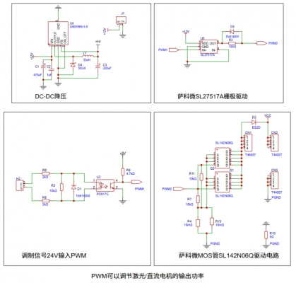 4.1 入力変調信号は、SLKOR PC817 フォトカプラ U2 を駆動するPWM波形を提供します。24Vパルス高レベル時、フォトカプラ電流は約6mAです(5V制御時、電流制限抵抗R6/R8で調整可能)。U2は主に信号絶縁を提供します。フォトカプラの電源は、SLKOR LM2596S-5.0 DC-DC電源管理IC(5V出力)から供給されます。外部変調信号はPLCから発生させることができます。D1(SLKOR スイッチングダイオード)はフリーホイールダイオードとして機能し、信号反転時にフォトカプラU2を保護するために導通します。