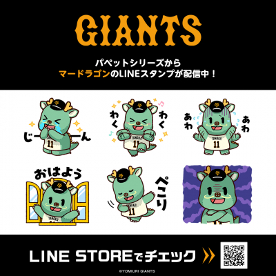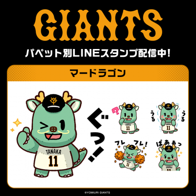 「読売ジャイアンツ」選手パペットシリーズインクルーズ描き起こしのキャラ別ver.のLINEスタンプ第11弾として日米通算200勝を達成した田中将大投手の「マードラゴン」がインクルーズより配信開始!