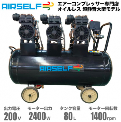 3. エアーコンプレッサー 静音 オイルレス 三相 200V 80L AIRSELF 大型サイズ 吐出量 450L(大気圧時)