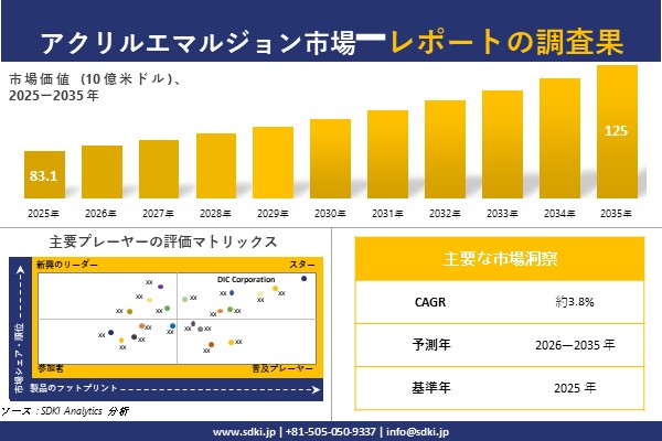 SDKI Analytics(本社:東京都渋谷区)は、このたび、2025年11月17に「アクリルエマルジョン市場調査レポート:2026-2035年の市場規模、シェア、傾向の予測」を発表しました。アクリルエマルジョンに関する市場調査レポートには、統計的および分析的アプローチを使用した予測評価が含まれています。この調査レポートでは、一次および二次調査方法を使用して分析された主要な業界洞察を通じて将来の傾向を理解できるようにすることで、主要な市場動向を読者に説明しています。