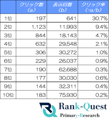 対象キーワードは、2025年10月中にランクエストサイトで検索結果1位から10位に掲載されたものに限定し、各順位ごとのクリック率を分析しました。