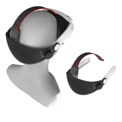 Meta社のVRヘッドセット「Meta Quest 3」「Meta Quest 3S」は、標準装備の場合、伸縮性のあるゴムバンドで頭部を締め付けて固定します。