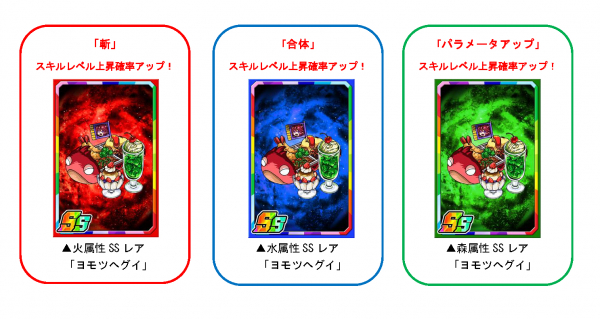 「黄泉がえりP」を使い素材ガチャを回すと、限定強化素材「ヨモツヘグイ」を手に入れることができます。一部のモンスターに使うと強化値2倍の効果があるほか、斬・合体・パラメータアップのスキルレベル上昇確率もアップします。