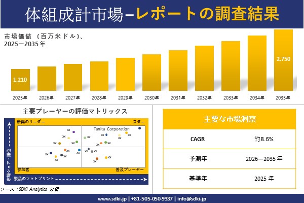 SDKI Analytics(本社:東京都渋谷区)は、このたび、2025年11月19に「体組成計市場調査レポート:2026-2035年の市場規模、シェア、傾向の予測」を発表しました。体組成計に関する市場調査レポートには、統計的および分析的アプローチを使用した予測評価が含まれています。この調査レポートでは、一次および二次調査方法を使用して分析された主要な業界洞察を通じて将来の傾向を理解できるようにすることで、主要な市場動向を読者に説明しています。