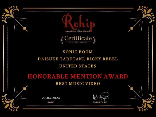 Rohip International Film Festival:「Best Music Video」部門 受賞 および Honorable Mention(佳作)入選、本受賞に際し、リッキー・リーベルと樽谷大助の連名で表彰状が授与されています。