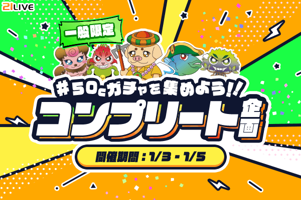 1月3日(土)から1月5日(月)までの3日間、 21LIVEにて『50Cガチャを集めよう!!コンプリート企画』を実施します。