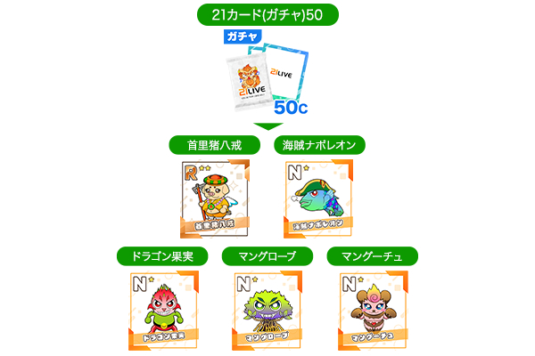 50Cガチャから登場する5種類のキャラクターを集めると、コンプリート達成回数に応じて21LIVEオリジナルグッズをプレゼントします。