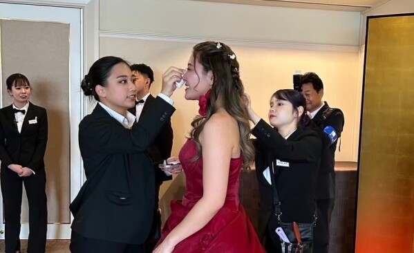 学生がウエディングプランナー、司会進行、ドレスコーディネート、ヘアメイク、サービススタッフまで、役割分担を行いながら現場運営を担当します。授業で培った専門技術だけでなく、チームワークや現場対応力、ホスピタリティマインドを実践の場で養うことを目的としています。<過去のウェディングプロデュース時の様子>