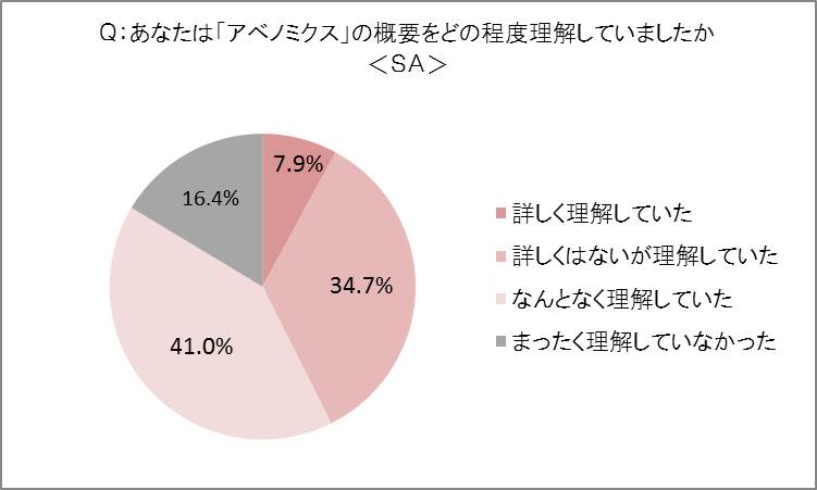 ───はじめに、ビジネスパーソンが「アベノミクス」の概要についてどの程度理解しているかを聞いてみたところ、全体の83.6%が理解していたことがわかりました。「理解」の内訳としては、「詳しく理解していた(7.9%)」、「詳しくはないが理解していた(34.7%)」、「なんとなく理解していた(41.0%)」となり、理解している人の半数近くが「なんとなく」の理解に留まっています。