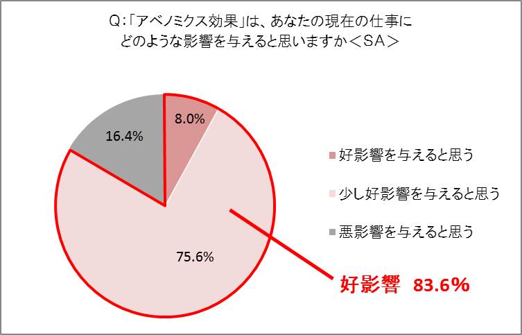 ───「アベノミクス効果」は、日経平均株価や円相場など、数値的な要素が注目されることが多いですが、数値には表れにくい、ビジネスパーソンの仕事への影響や、キャリアアップ・スキルアップに対するモチベーションへの影響などを確認してみました。まず、「アベノミクス効果」が現在の仕事にどのような影響を与えると思うかについて聞いてみたところ、「好影響」が83.6%となりました(※「好影響を与えると思う(8.0%)」と「少し好影響を与えると思う(75.6%)」の合計)。