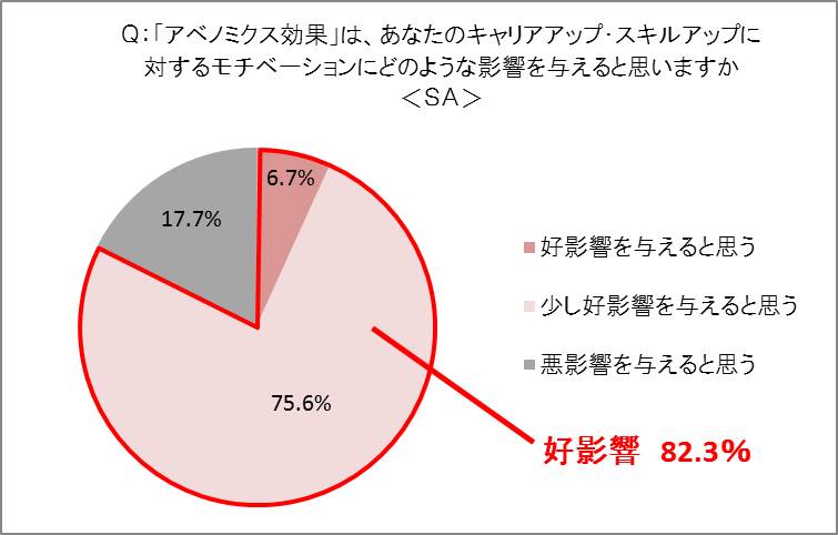 さらに、「アベノミクス効果」がキャリアアップ・スキルアップに対するモチベーションにどのような影響を与えると思うかについても聞いてみたところ、こちらも「好影響」が82.3%と、非常に高い回答結果となりました(※「好影響を与えると思う(6.7%)」と「少し好影響を与えると思う(75.6%)」の合計)。