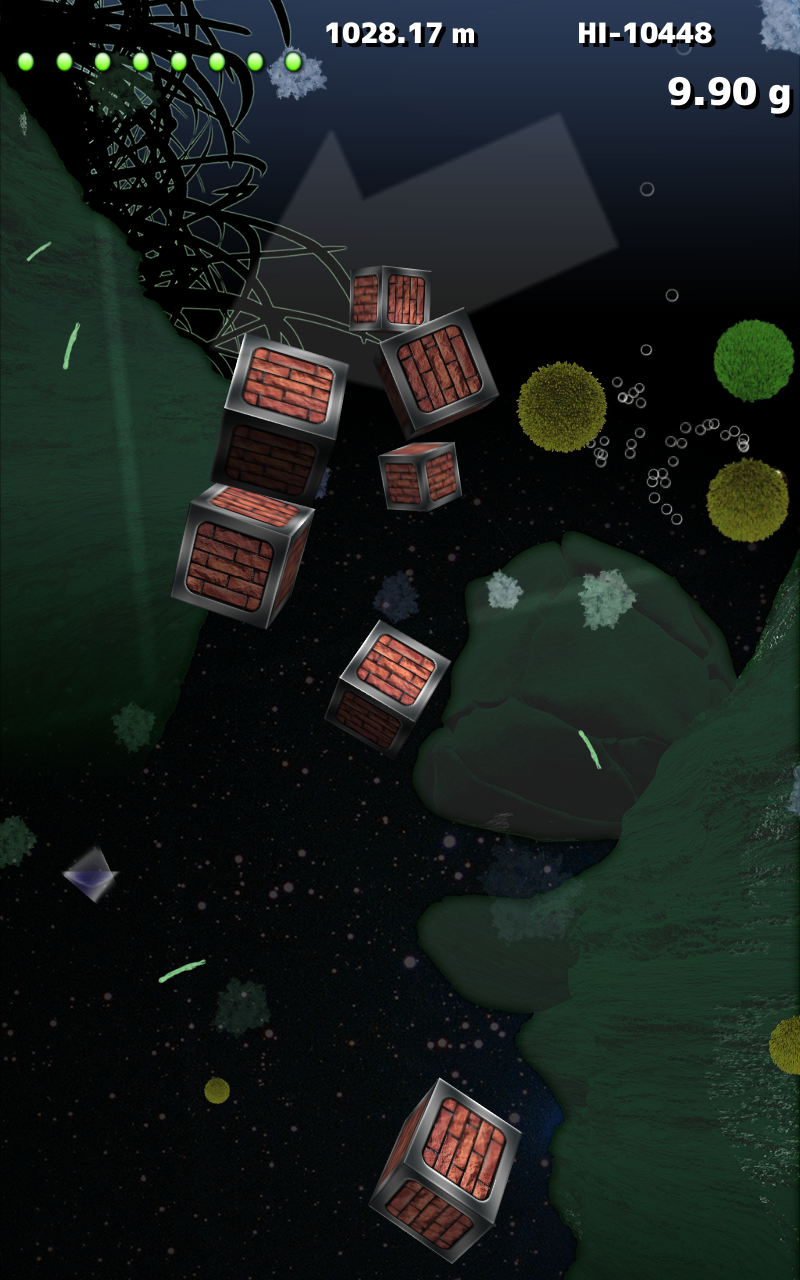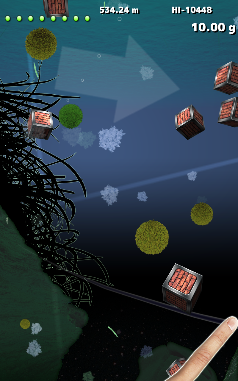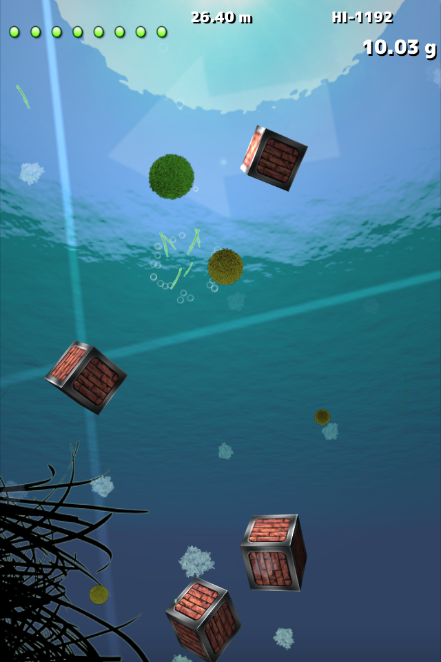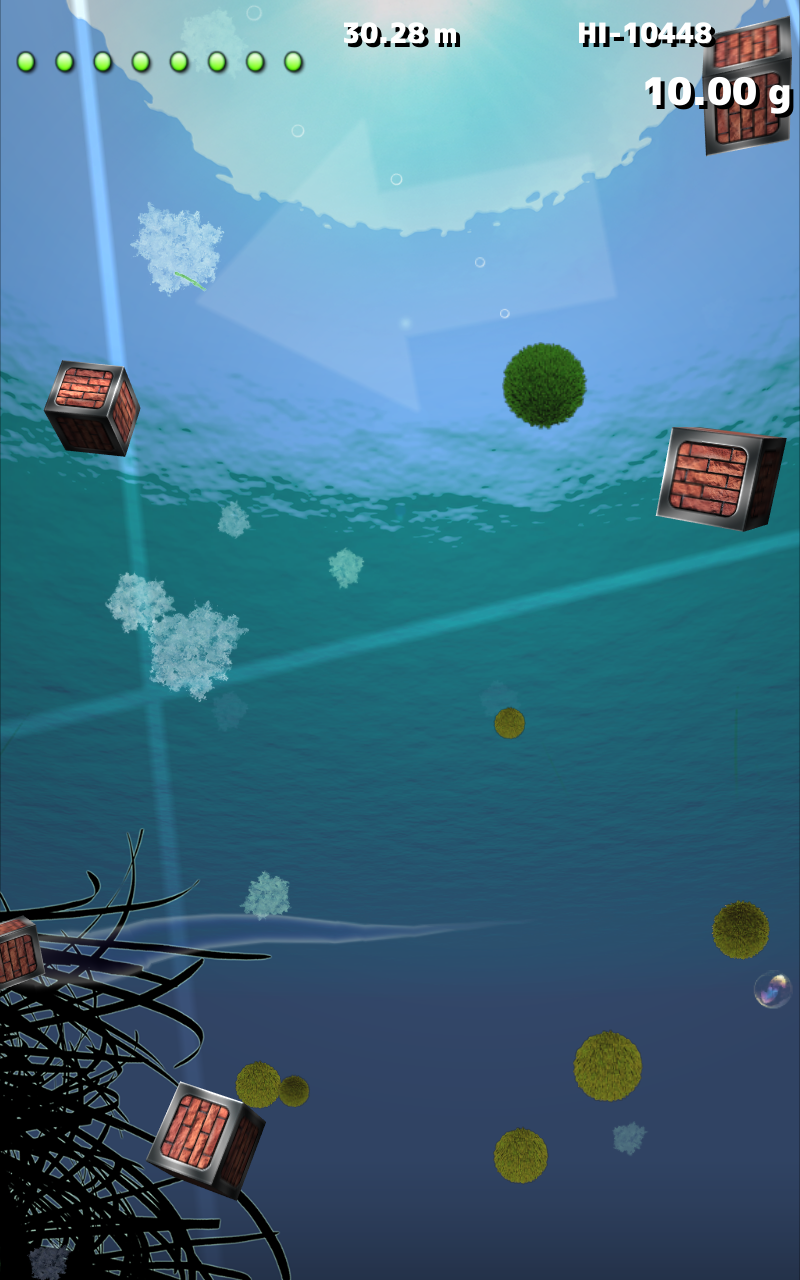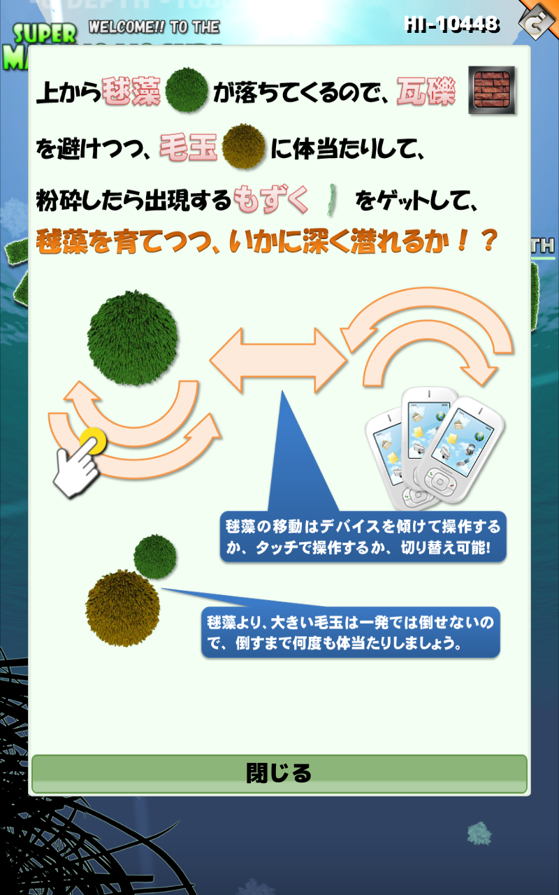 海中に沈みゆく毬藻を育てながら、瓦礫を避けてどれだけ深く潜れるかを競う新感覚マリモもぐりゲーム。