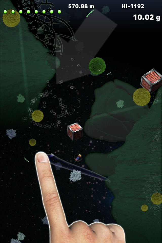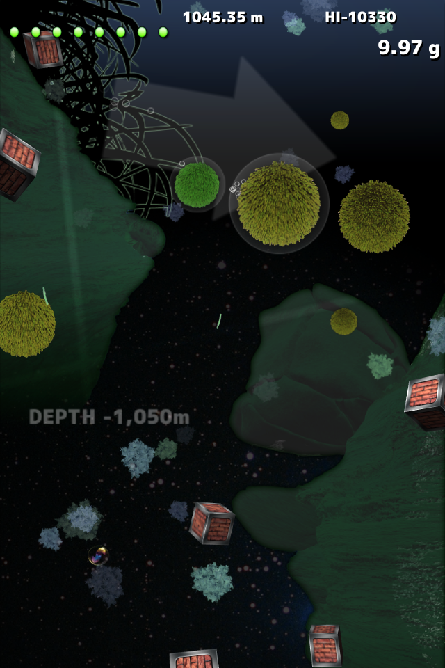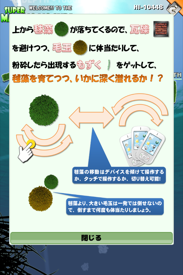 "スーパーマリモもぐり"は、海中に沈んでゆく毬藻を愛でつつ育てながら、障害物を避けてどんどん深く潜って行く、毬藻育成型深海探索ゲームです。