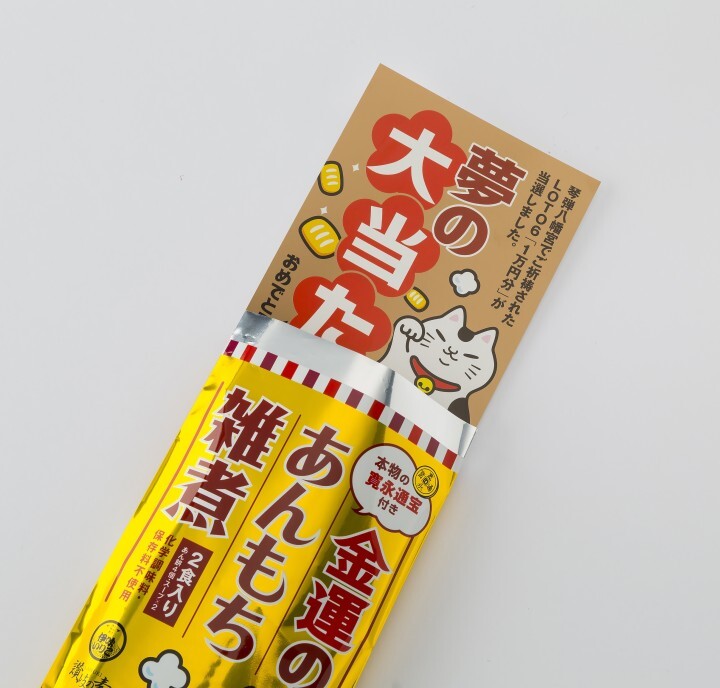 パッケージの中にアタリ券が入っていれば、史上最高額の16億円が出た宝くじ売り場 観音寺チャンスセンターで発券された、ロト6 抽選券 1万円分(ご祈祷済み)をプレゼントする、春に向けて縁起の良い即席お雑煮です。
