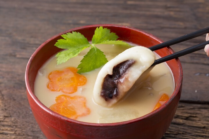 讃岐では、いりこ(煮干し)を使った出汁をベースに、甘い白味噌で味を整え、中に黒餡が入った「あん餅」を、お正月に雑煮としていただきます。