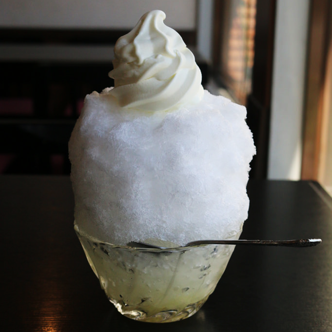 グレープフルーツがごろごろ入った上に山盛りカキ氷、頂上にソフトクリームが鎮座しています。生の果汁のみでつくられたシロップはフレッシュで爽やか。ソフトクリームを混ぜるとミルキーな甘さが加わります。